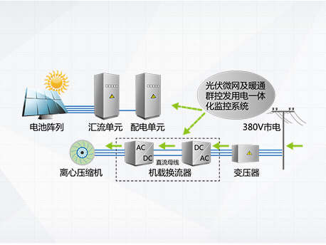 光伏發(fā)電系統(tǒng)不發(fā)電,主機向電網(wǎng)取電運行,機組相當(dāng)于常規(guī)高效變頻離心機。